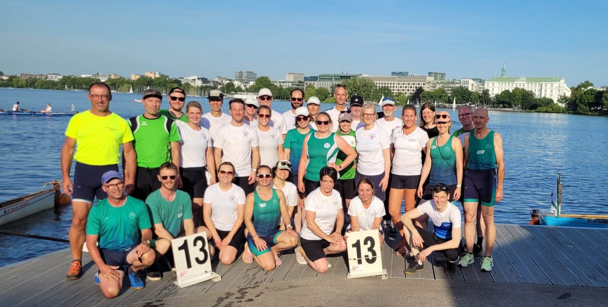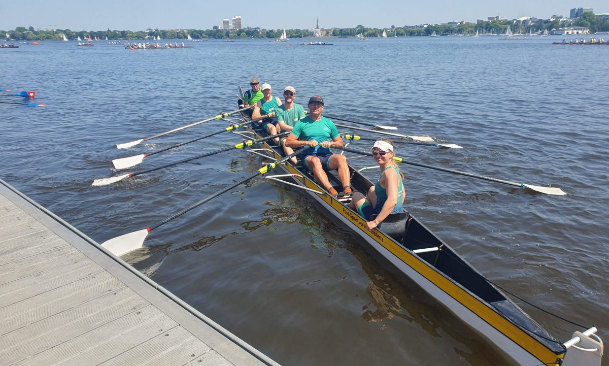 Obwohl ich in meinem sehr langen Rudererleben schon an vielen Ruderwettkämpfen teilgenommen habe, war es für mich die erste Teilnahme am Staffelrudern am 17. Juni. Was ist das Staffelrudern? Beim Staffelrudern treten mehrere Ruderteams, die aus ca. 25- 40 Ruder*innen aus einem oder mehreren Vereinen bestehen, gegeneinander an. Dieses Jahr waren es 25 Teams, die jeweils versuchten die meisten Runden auf dem Kurs über die Innen- und Außenalster in den 8 Stunden Wettkampfzeit zurückzulegen. Dabei ist jeweils ein Boot des Teams auf der Strecke, in einem zweiten macht sich eine andere Mannschaft fertig, die dann auf den Rundkurs geht, wenn das vorherige die Ziellinie überfahren hat und so geht es dann immer weiter, 8 Stunden lang.