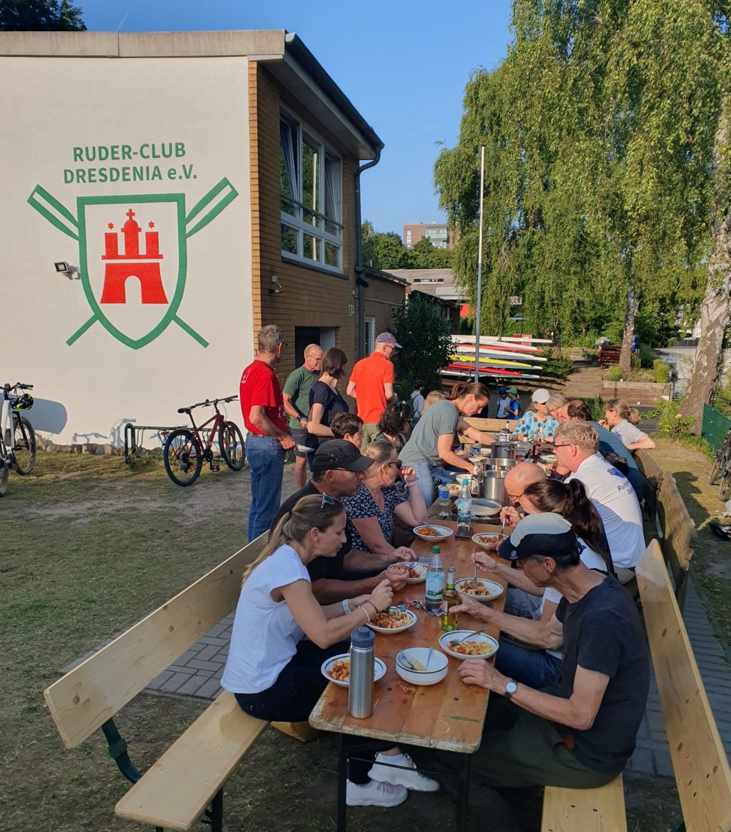 Aber am Ende hat es dank toller und motivierter Ruderinnen und Ruderer wieder allen großen Spaß gemacht. Die Renngemeinschaft hat gut zusammengearbeitet, Mannschaften wurden bunt gemischt und alles lief reibungslos ab. Nach den Rennen ruderten wir unsere Boote wieder zurück zum Bootshaus der Dresdenia. Nachdem die Boote versorgt wurden und wir uns alle frisch gemacht hatten, ließen wir den Regattatag wieder in großer Runde draußen mit Pizza und Getränken gemütlich ausklingen. Am Sonntag ging es dann nach dem Frühstück wieder auf die Heimreise. Es war wieder ein gelungenes Rennwochenende.